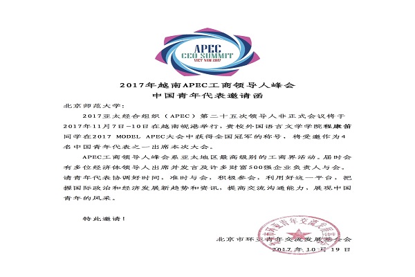 2017年11月8日至10日,亚太经合组织(APEC)工商领导人峰会在越南岘港举行。我校外国语言文学学院2014级本科生程康笛,因获得2017模拟亚太经合组织大会(MODEL APEC)冠军,作为中国青年代表随国家领导人一同出访。会议结束后,重返校园的程康笛继续奔波于课堂内外,回想起自己的APEC之旅,他仍不住地感叹“整个过程都让我非常震撼。”。